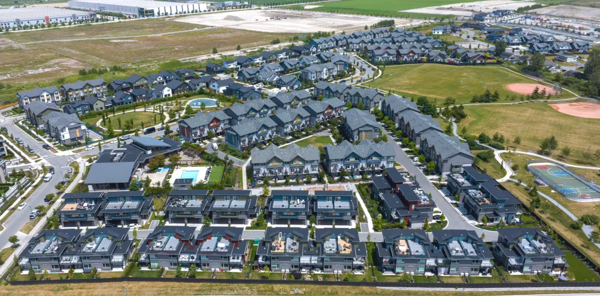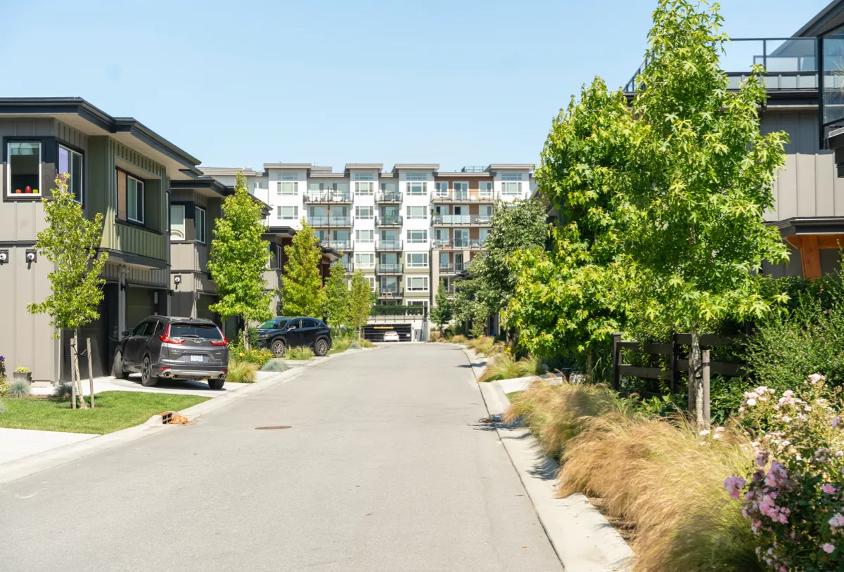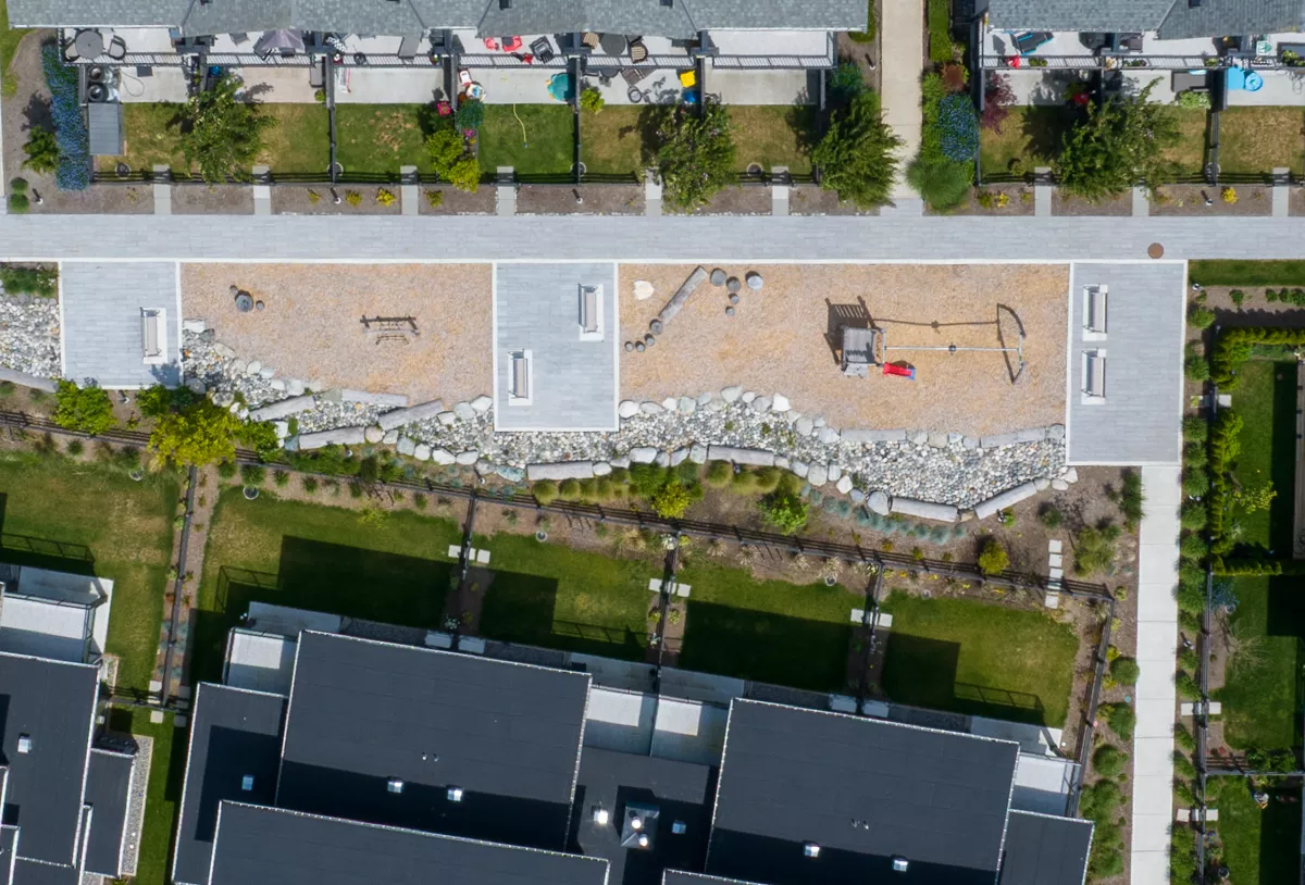 An Aquilini Development completed in 2025, Boardwalk is a townhouse development within the masterplanned Tsawwassen Shores community. Landscape designed by PMG includes interconnecting pathways to local parks, sports fields, other neighbourhoods, and wide views of the ocean. Shared park and playground spaces provide opportunities for social engagement, sports and recreational activities for local residents, and also includes an outdoor pool and amenity building.