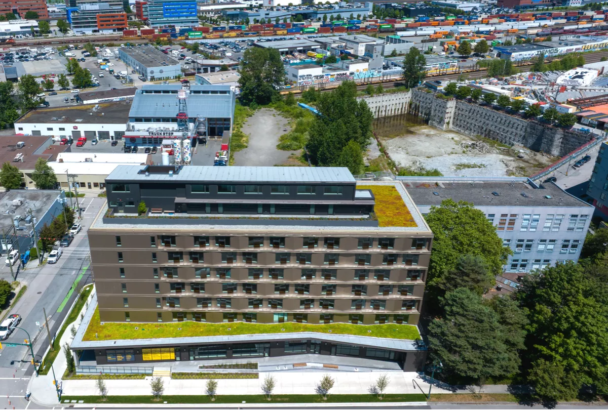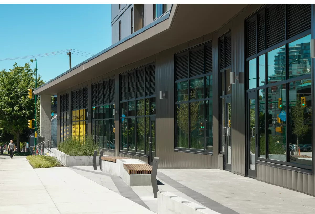 The landscape has been designed to be highly urban to reflect the commercial uses at grade, with nods to the industrial history of the site through the use of metal planters and architectural plantings. Diamond shaped pavers in three colours have been used in the recessed pedestrian plaza fronting East 2nd Avenue with retail entries highlighted by transitioning to darker pavers closer to doorways. Custom metal planters are used to take up the grade differential as the natural grade dips to the west. Bike racks with simple, clean lines do double duty as bollards at the property line to accommodate bicycle traffic while also delineating the semi-public plaza space fronting the commercial units from the public sidewalk.