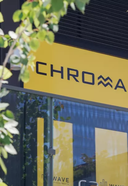 The Landscape design takes reference from the strong architectural expression of the buildings’ angular undulating façade and clean, linear forms.