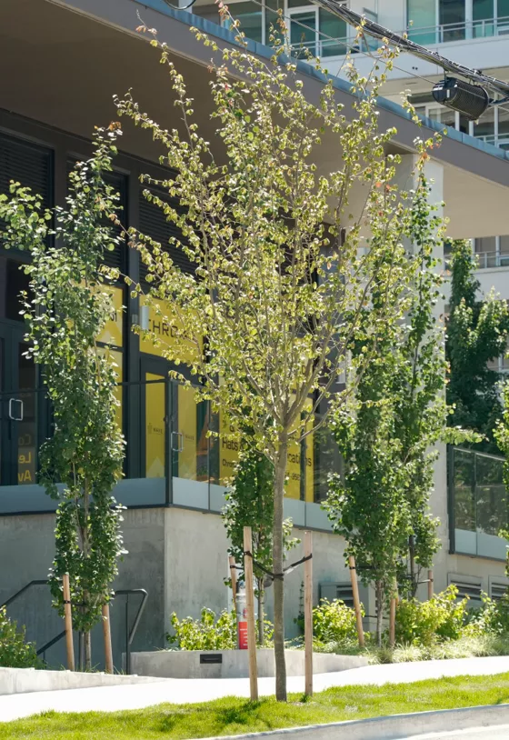A woodland bosque of columnar trees flowing down Scotia Street is proposed as a permeable screen to the patio situated at the southwest corner of the project as well as the residential entry, creating a vertical architectural expression with partial visual separation and a strong psychological separation from the street frontage. The bosque of trees and multi-layered understory provides a vertically layered, bird-friendly landscape.